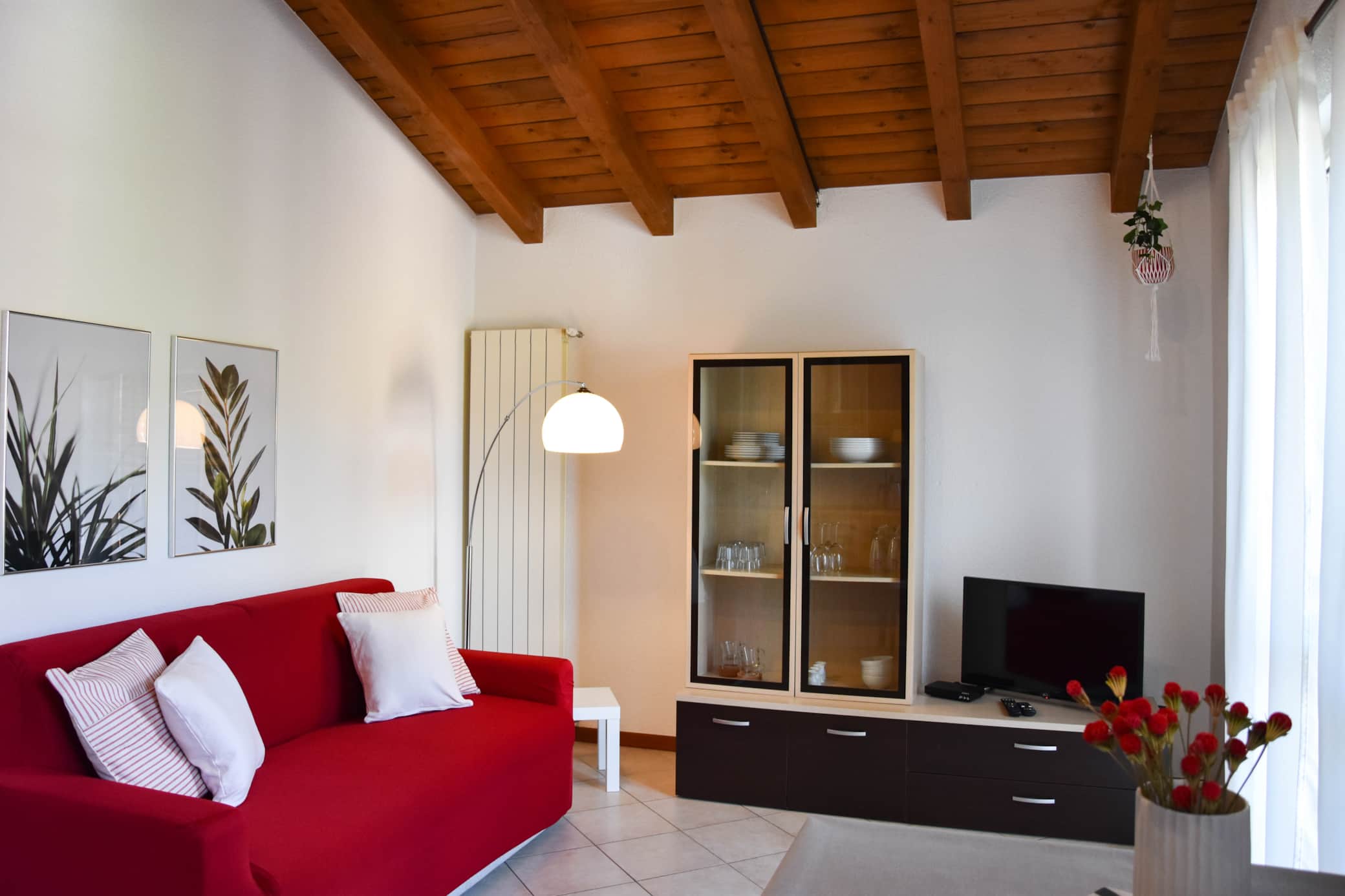 ・1 living room with Smart TV with foreign satellite channels and Netflix, a comfortable sofa bed, which can be used by the third guest if necessary, and a French window overlooking the terrace, surrounded by greenery.